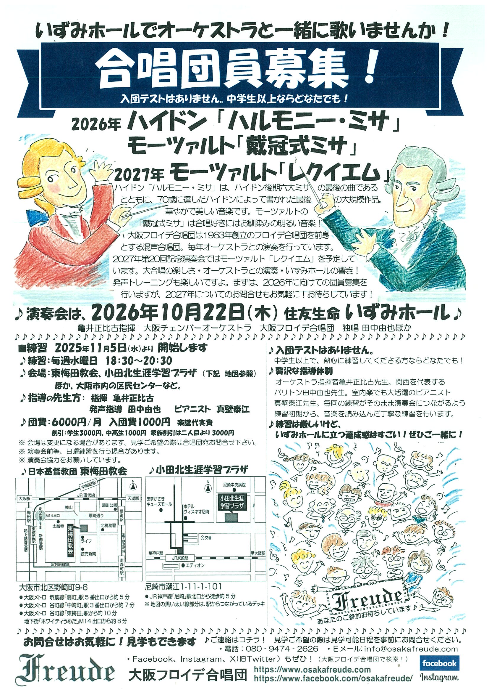 チケット | S:5000円、A:4500円、B:3000円 障がい者および高校生以下は割引あり。 詳しくは大阪フロイデ合唱団へお問い合わせください。 |